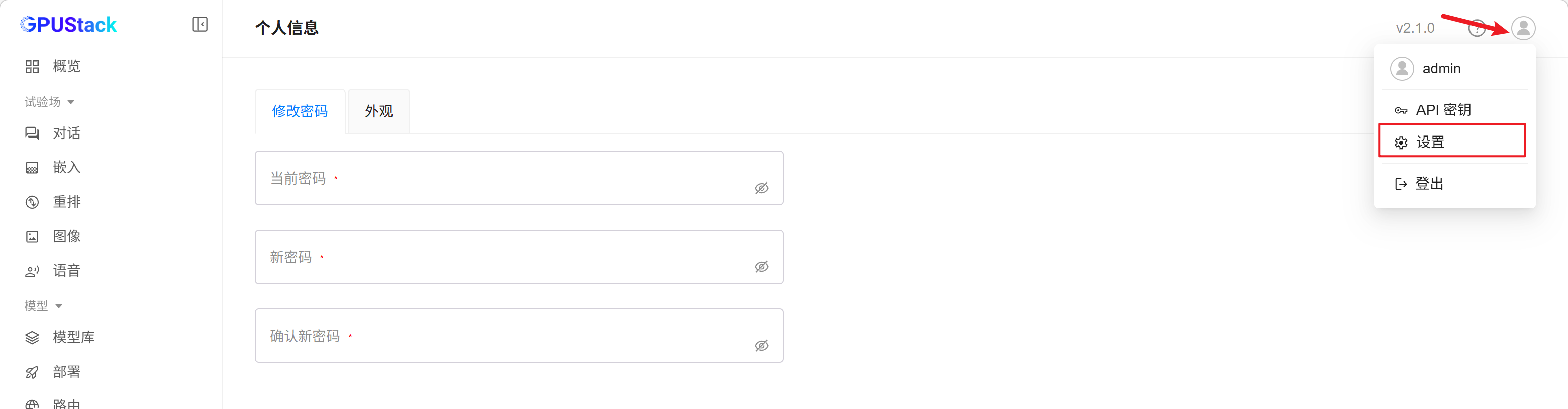 GPUStack平台的用户名及密码,可在登录后进行修改。
