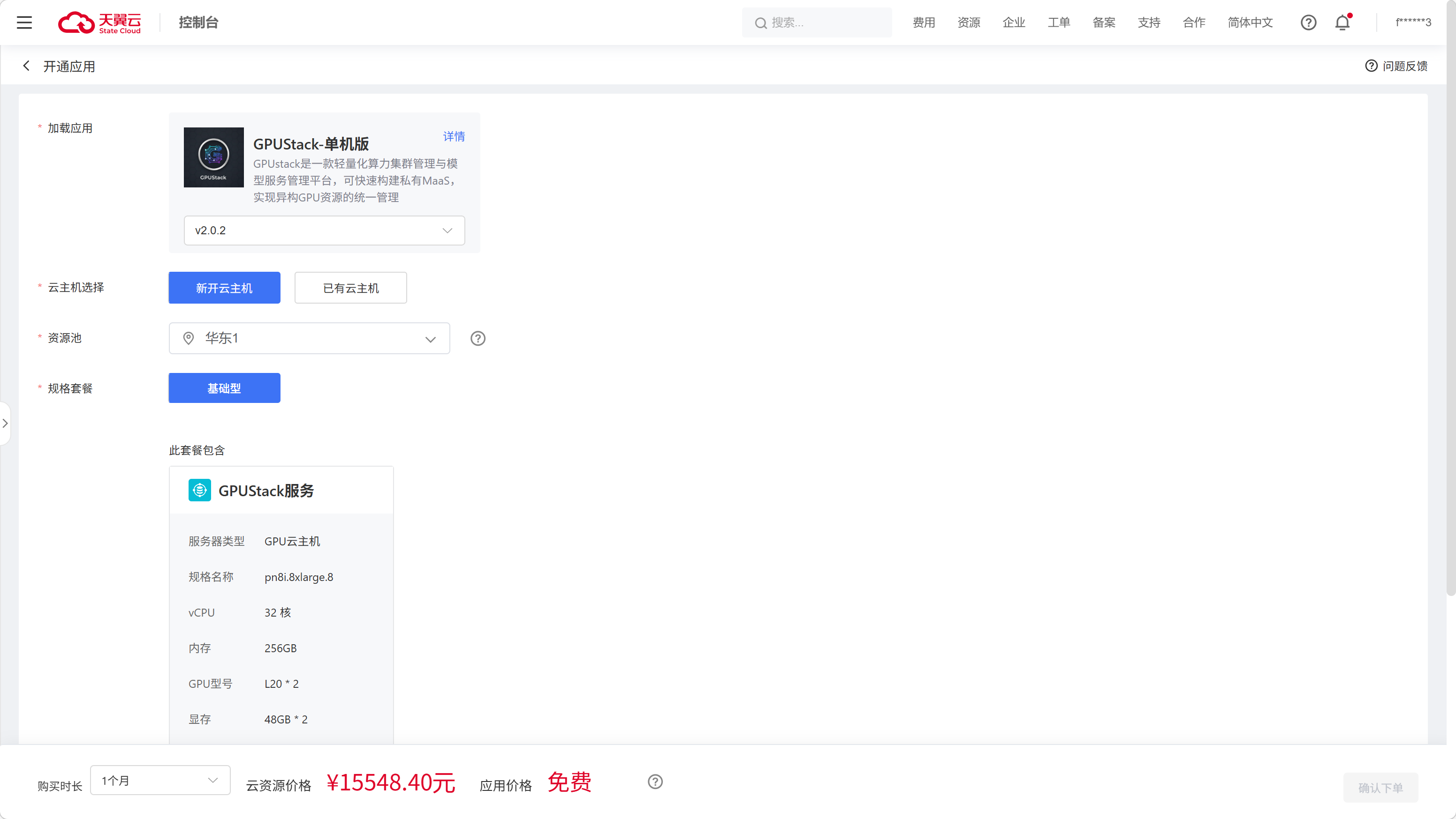 按提示订购“GPUstack 单机版”,点击“确认下单”。