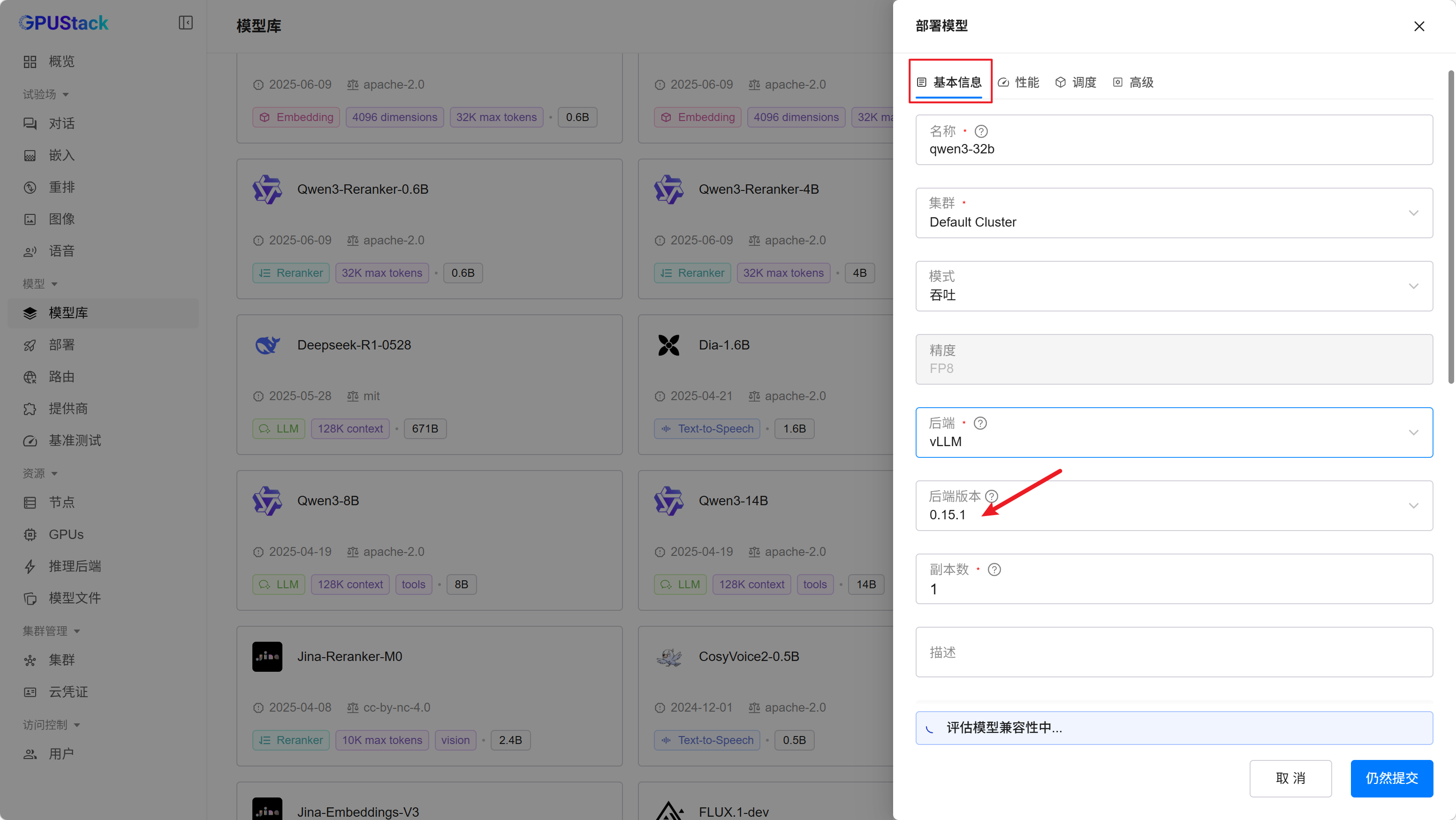 1)基本信息:点击基本信息tab,确认模型、推理后端、后端版本相互匹配,例如:“Qwen-32B”模型,推理后端为“vLLM”,后端版本建议选择“0.15.1”.