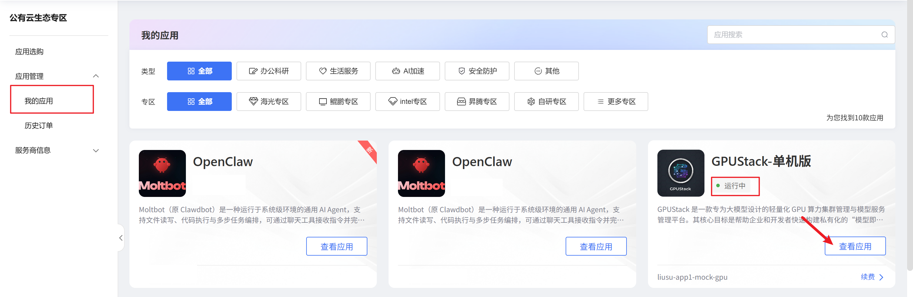 支付成功后,在我的应用页,查看应用状态,当应用状态为运行中时,代表GPUStack平台部署完成。