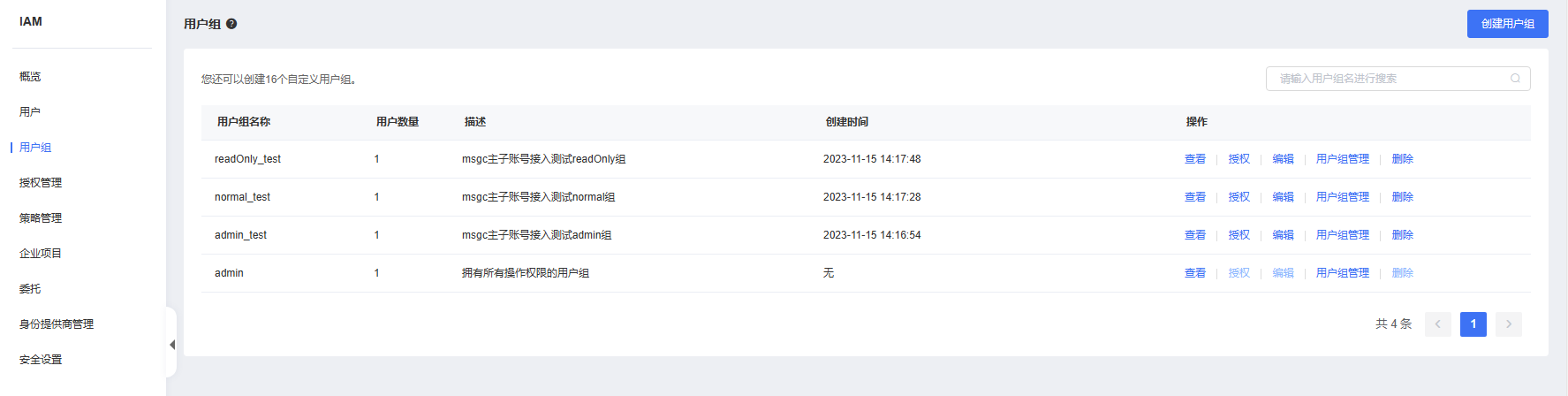 已创建IAM用户以及相应用户组,操作详情请参见创建IAM用户。