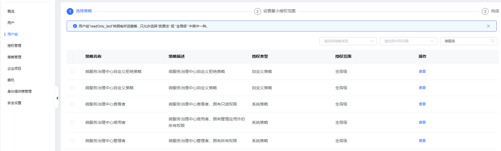 自定义策略:创建自定义策略可以支持更细粒度的授权,对于微服务治理中心,可以自定义功能访问权限以及资源访问权限。具体操作步骤请参考创建自定义策略。