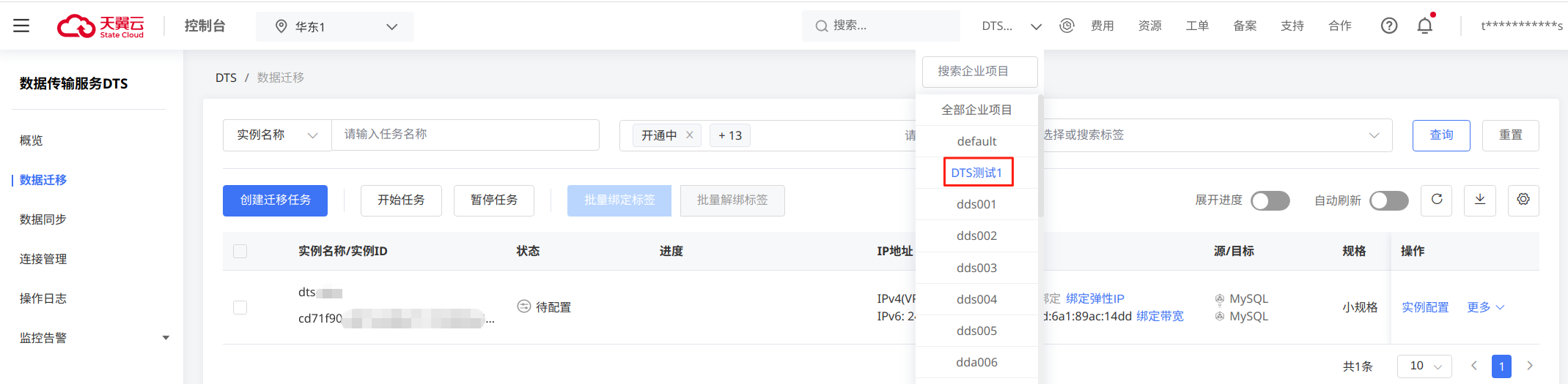 回到管理控制台,右上角选择目标企业项目,可以查看到以上步骤中迁出的实例。