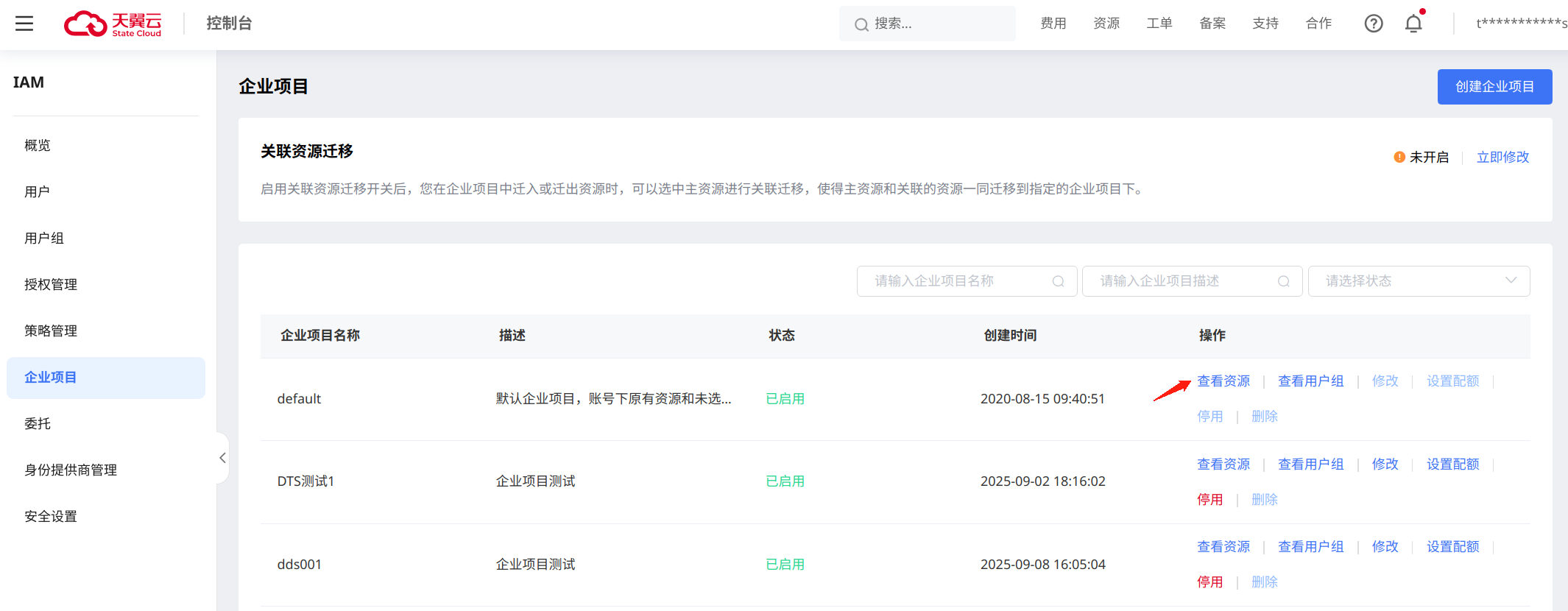 选择“企业项目”,并点击想要迁移的项目右侧的“查看资源”。