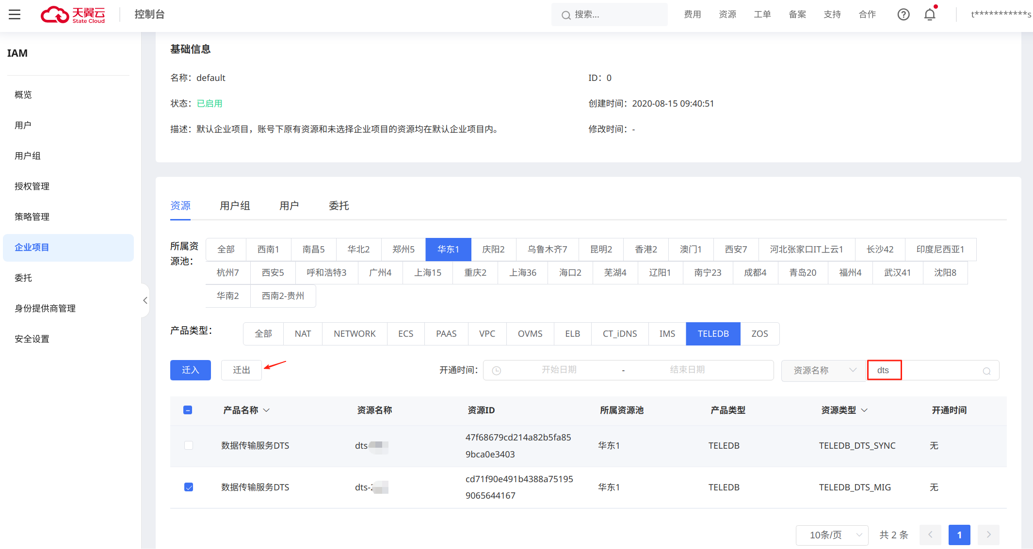 选择完毕,点击“迁出”,并选择迁移目标企业项目。