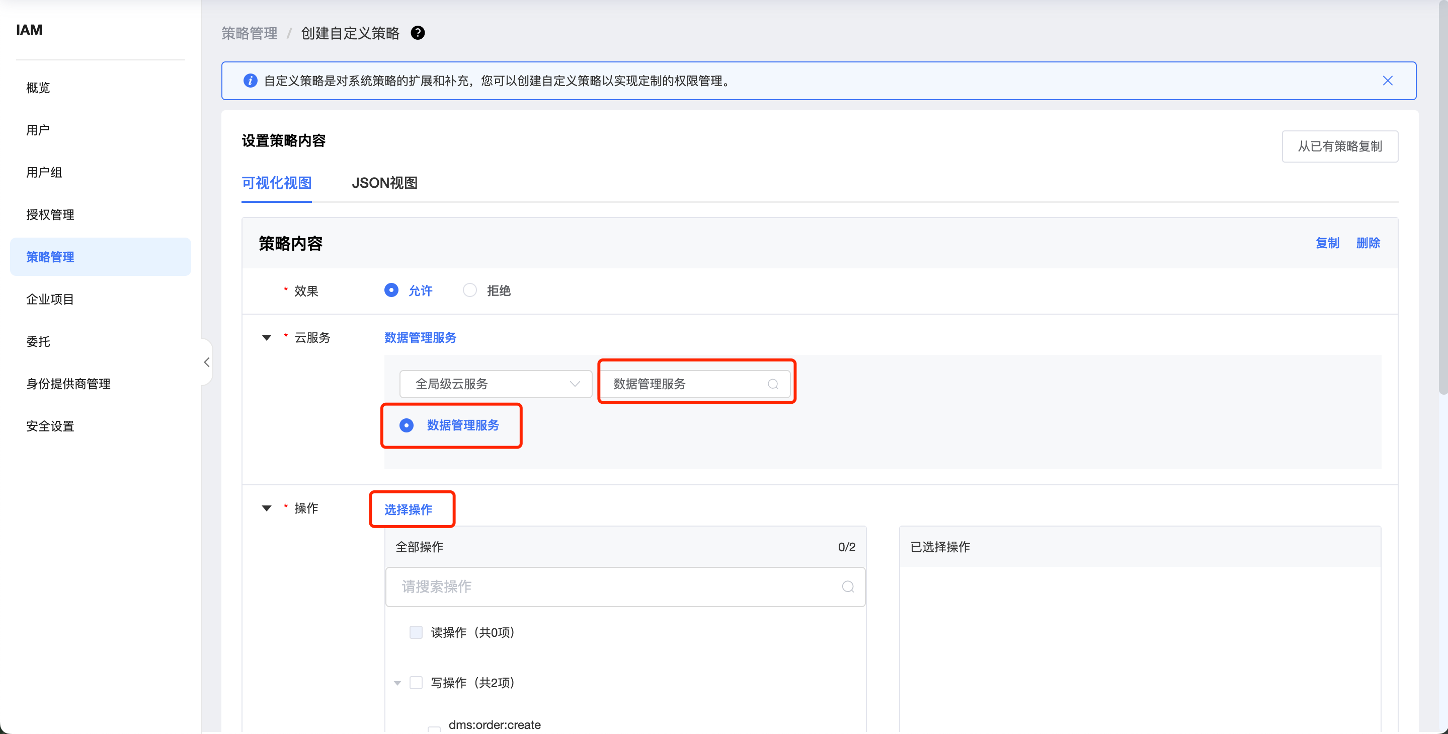 自定义策略 :由用户自己在IAM控制台创建和管理的权限集,是用户可以自由定义的权限,是对系统策略的扩展和补充。