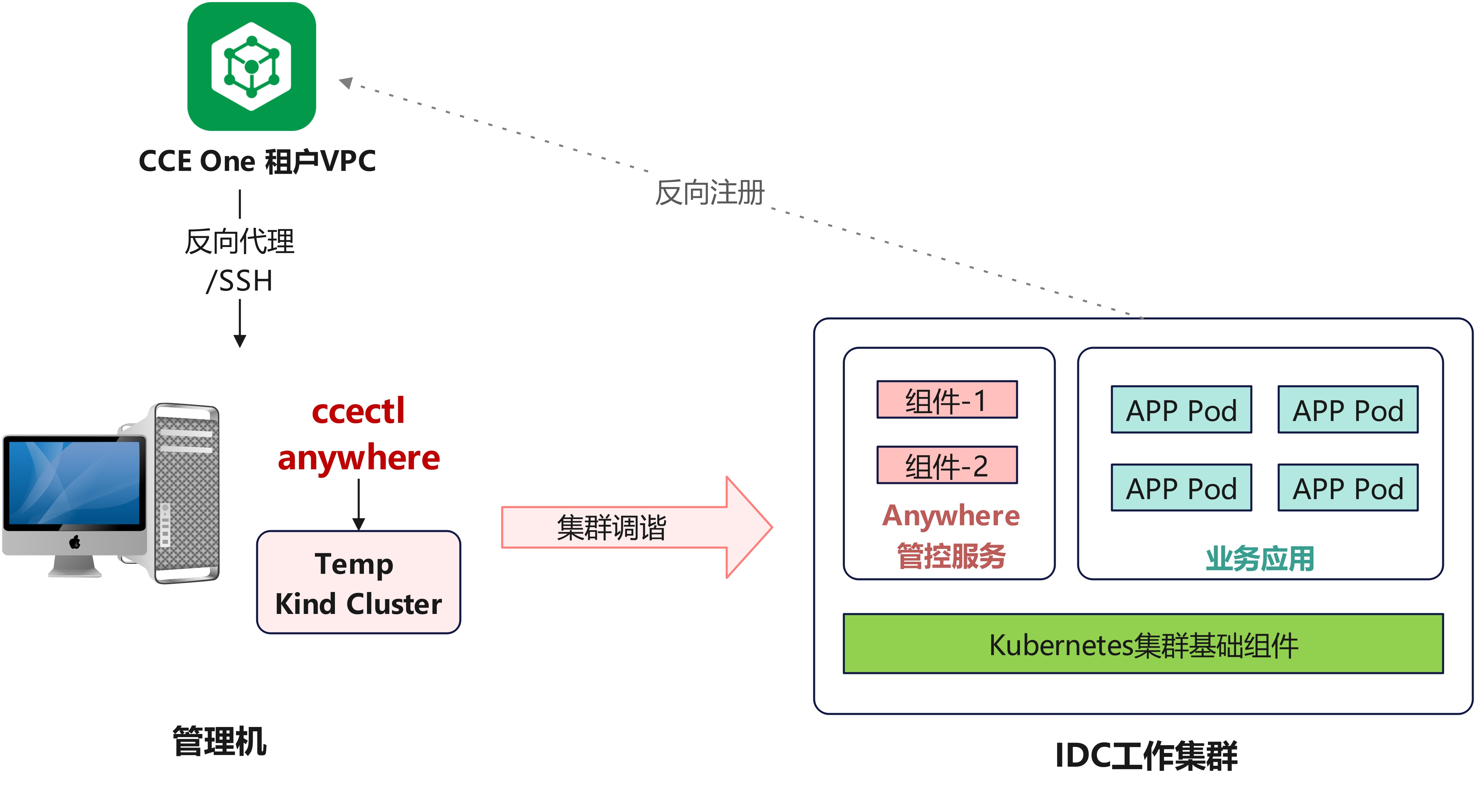 集群节点:部署由CCE Anywhere控制面创建和管理的目标集群,用于长期运行CCE Anywhere部署服务组件及运行用户工作负载;其生命周期由Anywhere控制面组件控制。