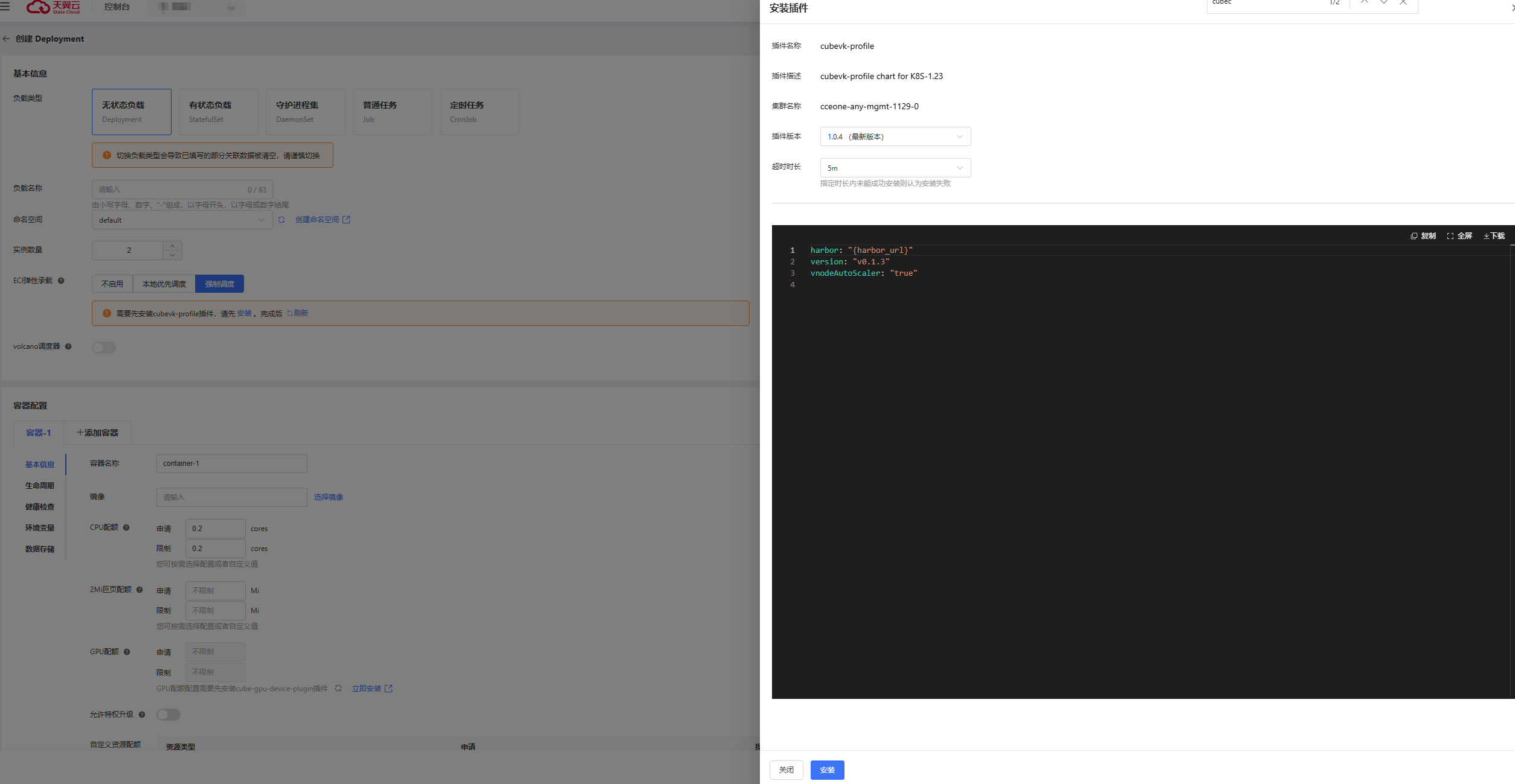 在分布式容器云平台控制台,进入所需操作的集群页面,可以在创建工作负载时选择安装,或者去插件 -> 插件市场,找到cubevk-profile插件安装;