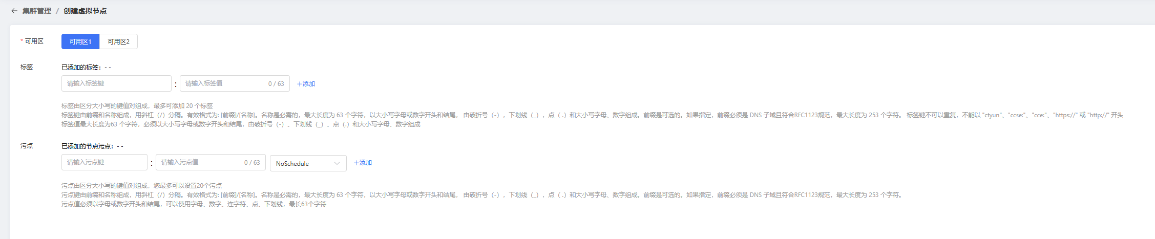 选择可用区,如有需要添加标签和污点,确定创建;