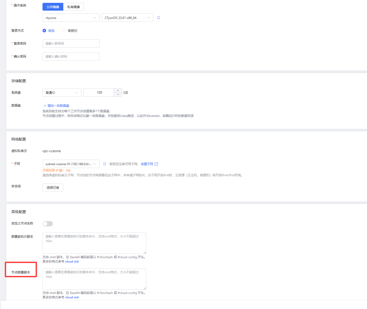 单击 创建节点池,在创建页面填写信息时,节点配置处操作系统选择上述导出的私有镜像;高级配置处填写节点部署脚本,完成创建。