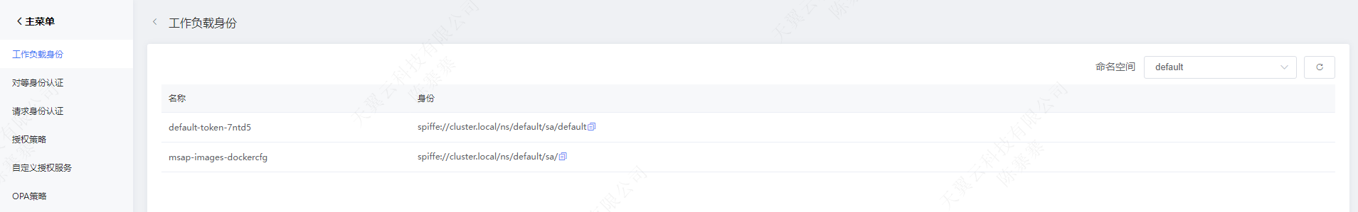 在服务网格控制台 网格安全中心-> 工作负载身份菜单下,选择namespace可以看到该命名空间下的工作负载身份信息,如下图: