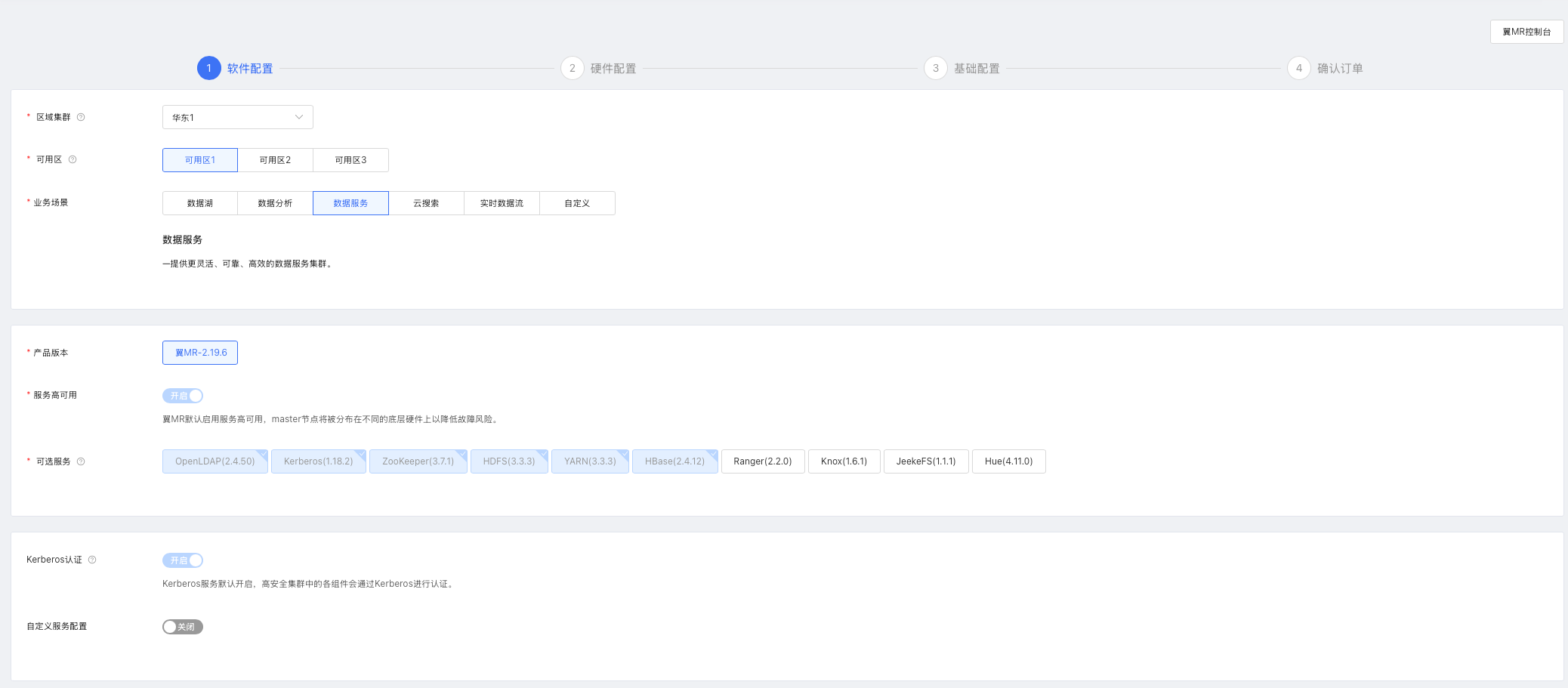 进入“创建集群”页面进行配置与订购,软件配置页面如下图所示,参数说明如下: