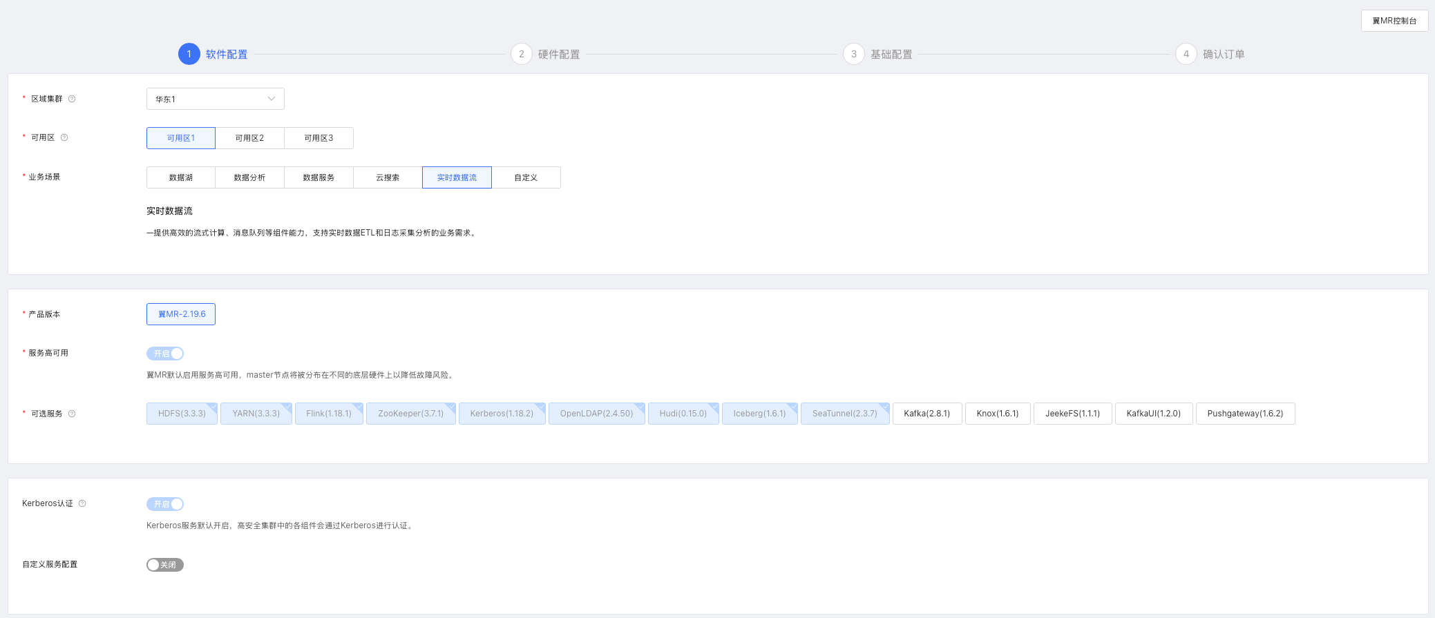 进入“创建集群”页面进行配置与订购,软件配置页面如下图所示,参数说明如下: