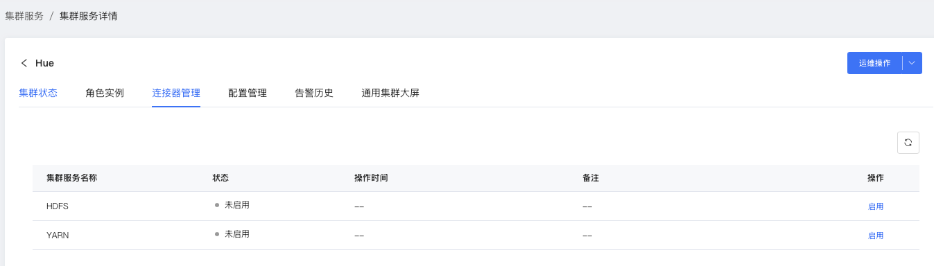 使用Hue WebUI编辑器前,请前往翼MR Manager-集群服务-Hue-连接器管理页面,选择需要启用的连接器,启用成功后,请在页面右上角的运维操作中重启Hue集群服务。重启后,即可前往Hue WebUI页面进行使用。