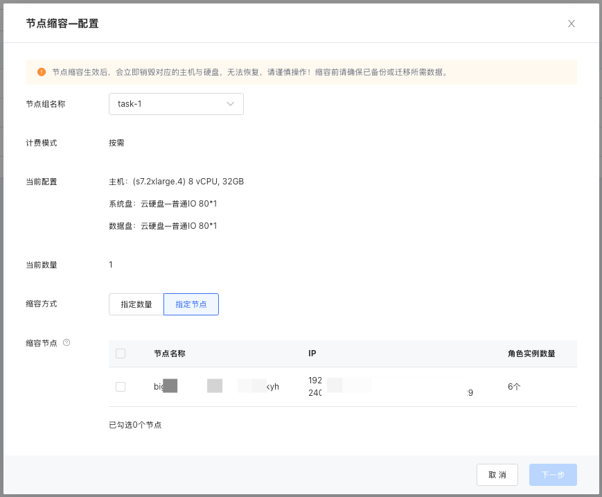 节点缩容生效后,会立刻销毁对应的主机与硬盘,无法恢复,请慎重操作!缩容前请确保已备份或迁移所需数据。