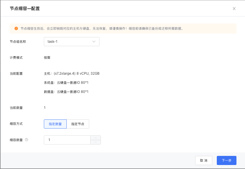 指定数量:缩容方式选择“指定数量”后,请设置需要缩容的节点数量,系统将基于节点状态,优先选择状态异常的节点进行缩容。