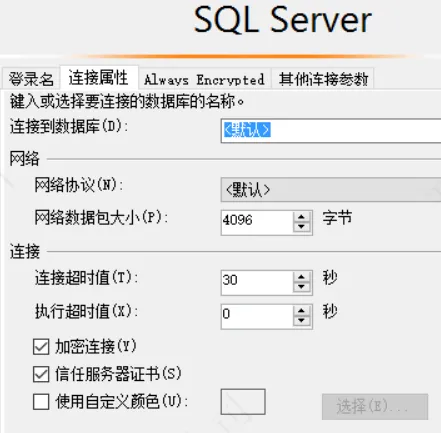 在连接属性选项卡中,勾选加密连接和信任服务器证书,并单击连接。