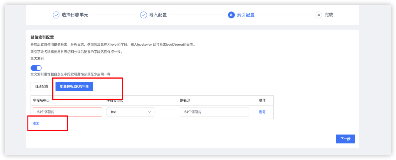 在索引配置流程中,根据查询需要配置索引字段。如索引字段较多,可以使用【批量解析json字段】,将日志样例复制进去,可以快速添加索引。
