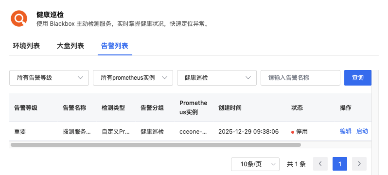 接入健康巡检后,系统将自动创建一条告警规则,告警触发条件为“拨测路径xxx在过去1分钟内拨测失败”。您也可以对告警内容进行修改编辑。