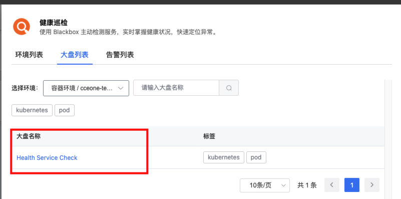 选择“健康巡检”卡片,在在大盘列表页签下,选择指定的容器环境。点击大盘名称即可查看对应的巡检大盘。