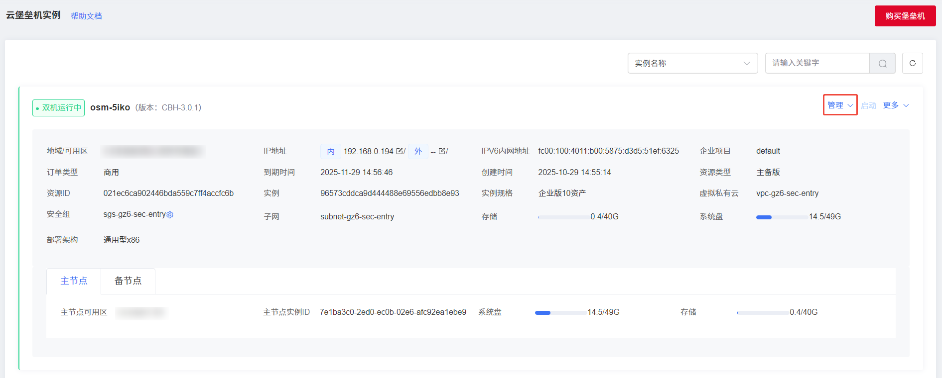 在“云堡垒机实例”列表条目录中选择要管理的实例,单击“管理”。