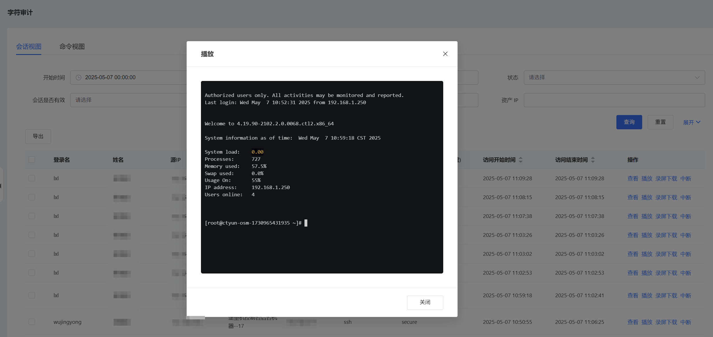 通过播放按钮,可在线实时审计或回放用户的操作行为。