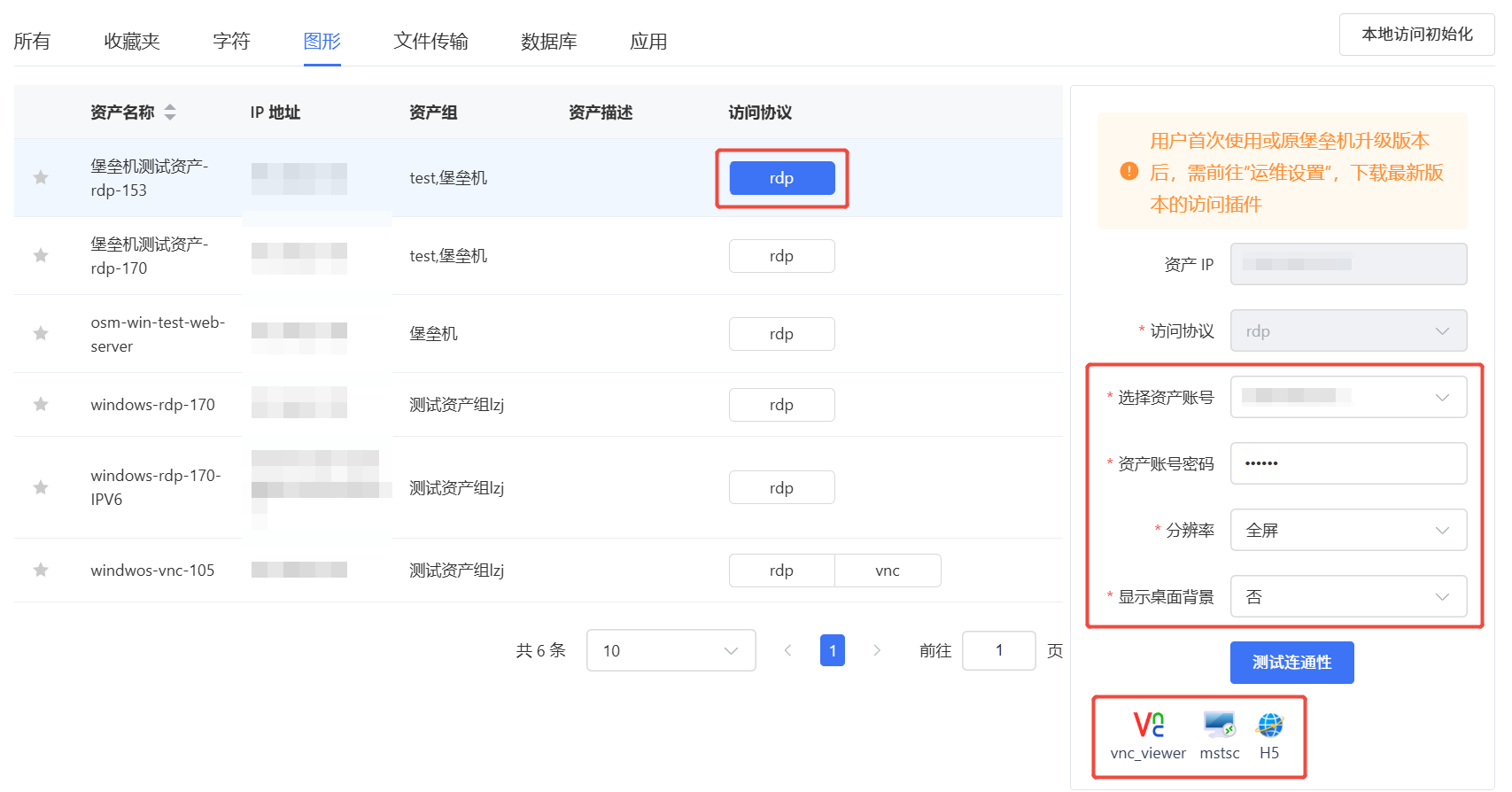 3.选择需要访问的资产,单击“访问协议”,在右侧选择和填写相关内容后,单击需要使用的运维工具(如mstsc、H5等),即可单点登录访问图形资产。