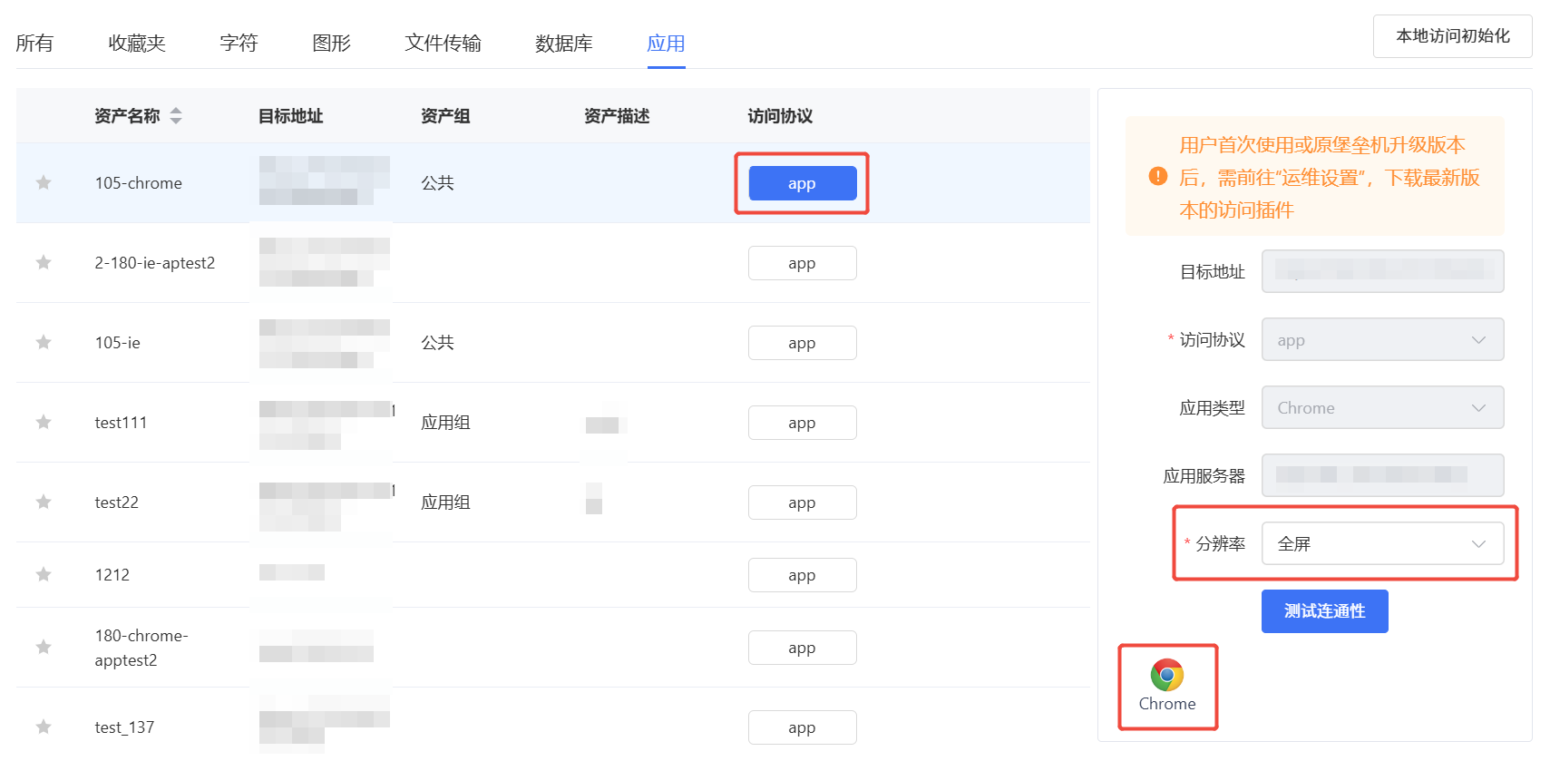 3.选择需要访问资产,单击需要使用的访问协议,在右侧选择相关内容,单击需要使用的运维工具(如Chrome等),即可单点登录访问应用资产。