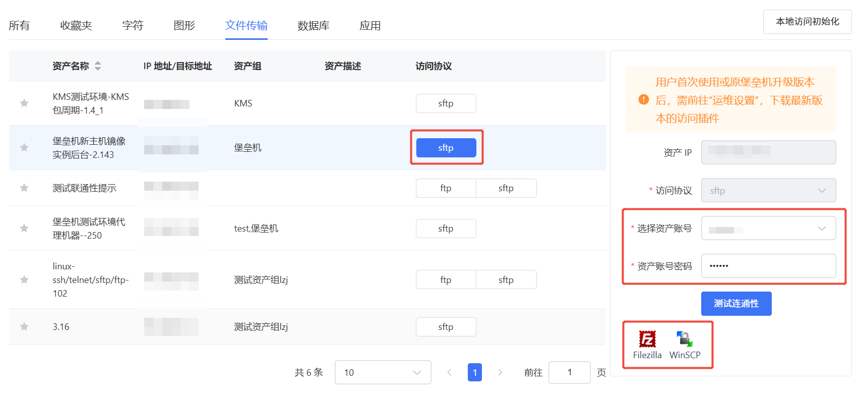 3.选择需要访问的资产,单击“访问协议”,在右侧选择和填写相关内容后,单击需要使用的运维工具(如Filezilla、WinSCP等),即可使用文件传输。