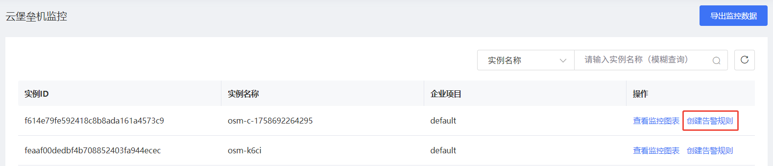 在云堡垒机监控列表中选择目标的实例,单击操作列的“创建告警规则”。