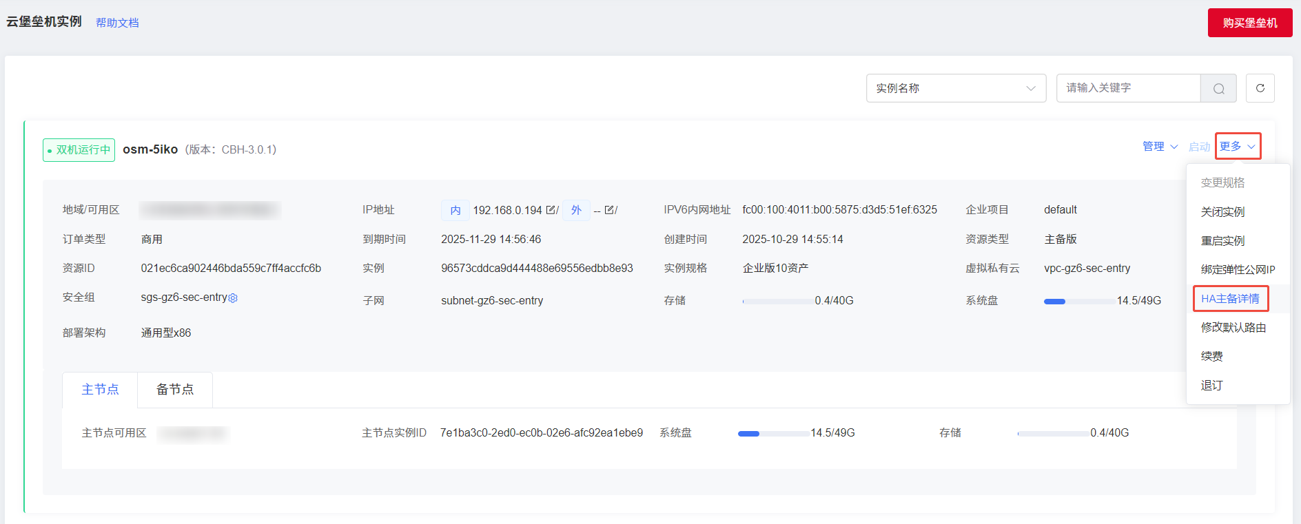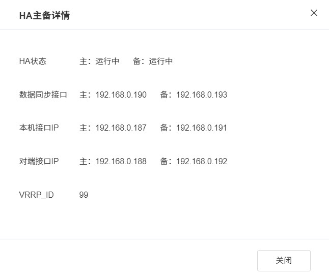 查看HA主备详情,查看主备节点的运行状态、IP地址等信息。