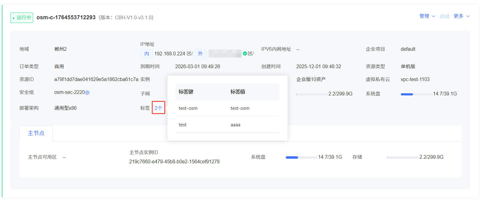 标签绑定成功后,鼠标点击实例信息的“标签”数量,可查询标签绑定情况。