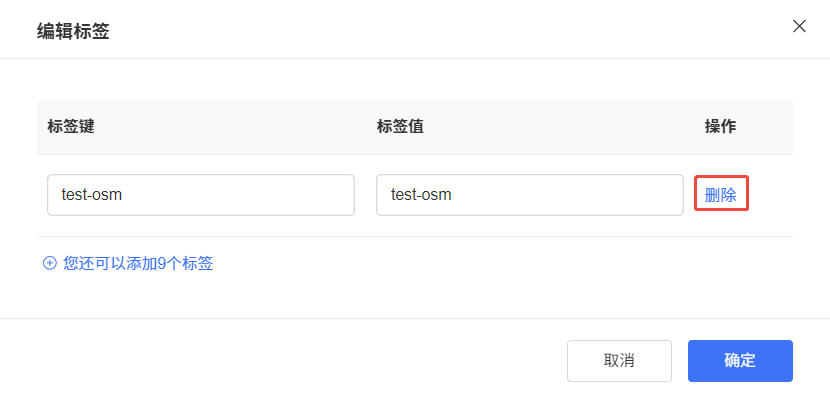在弹出的编辑标签窗口中,单击目标标签操作列的“删除”。