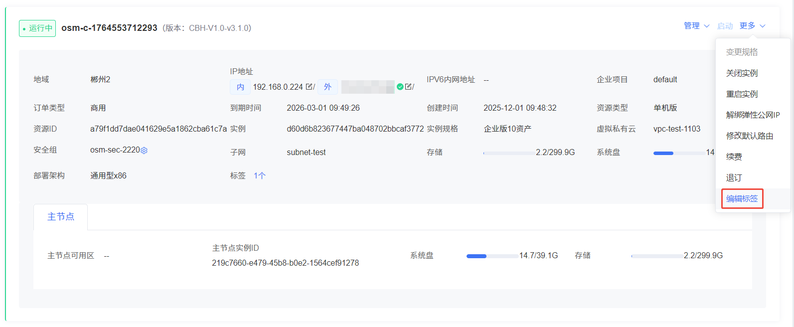 选择需要添加标签的堡垒机实例,单击“更多 > 编辑标签”。