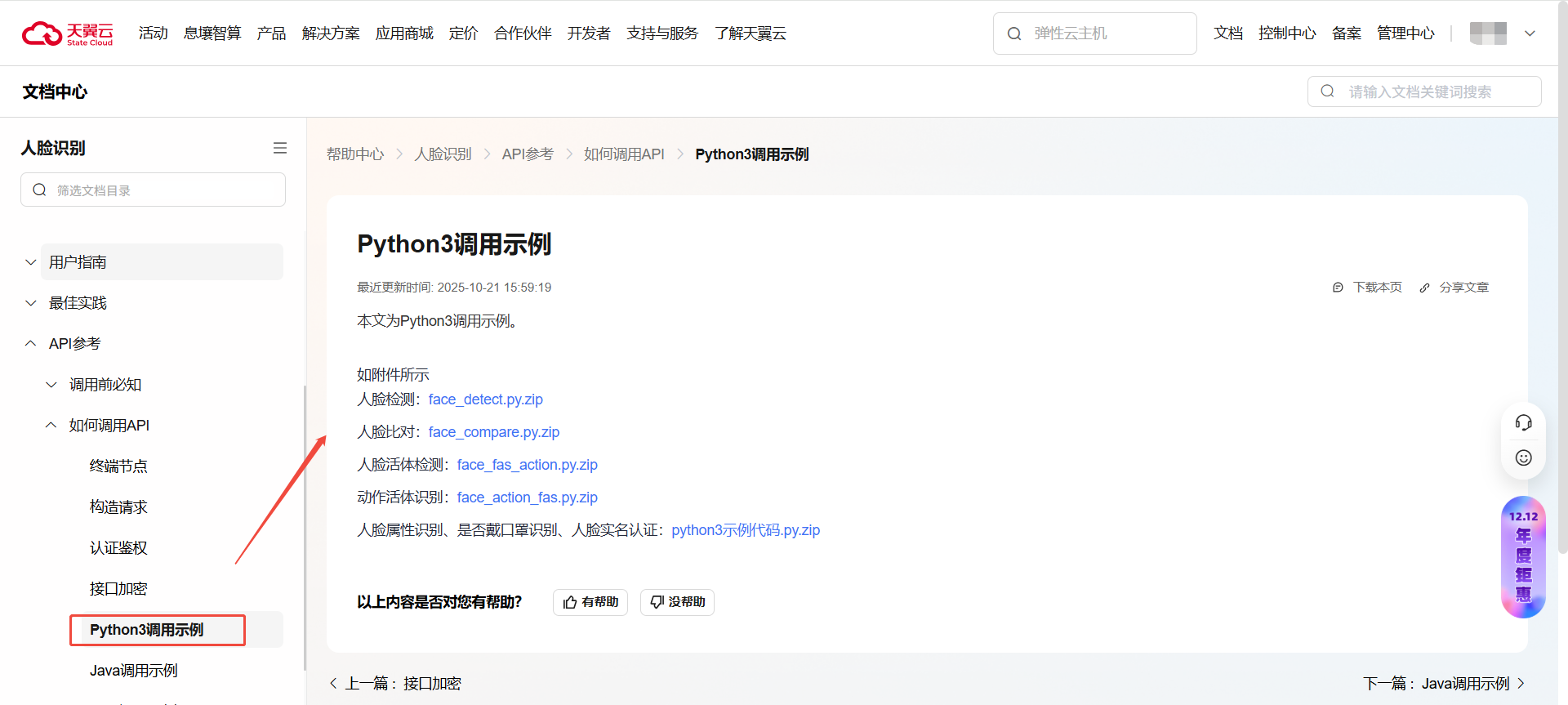 1、选择合适自己的开发工具,在这里用Python为例,点击Python3调用示例,选择对应API的调用示例调试;