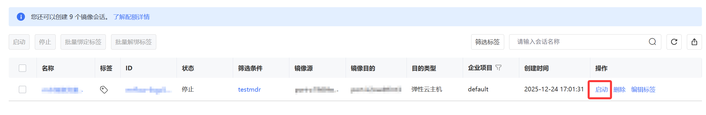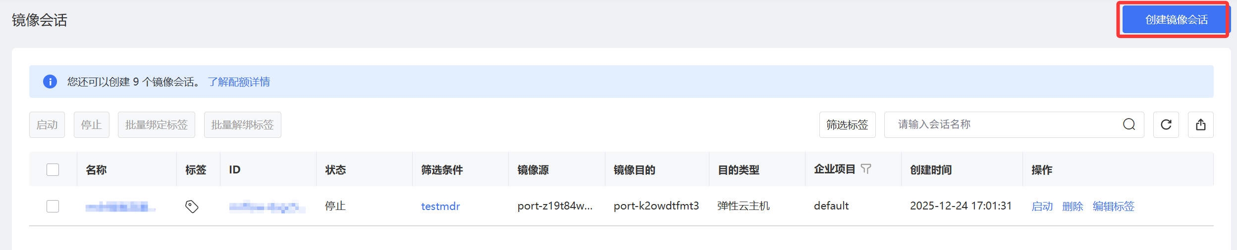 在左侧导航栏选择“流量镜像 > 镜像会话”,创建镜像会话,选择对应筛选条件,配置镜像源和镜像目的:镜像源选择需要监测的弹性网卡,镜像目的选择态势感知控制端的辅助网卡。