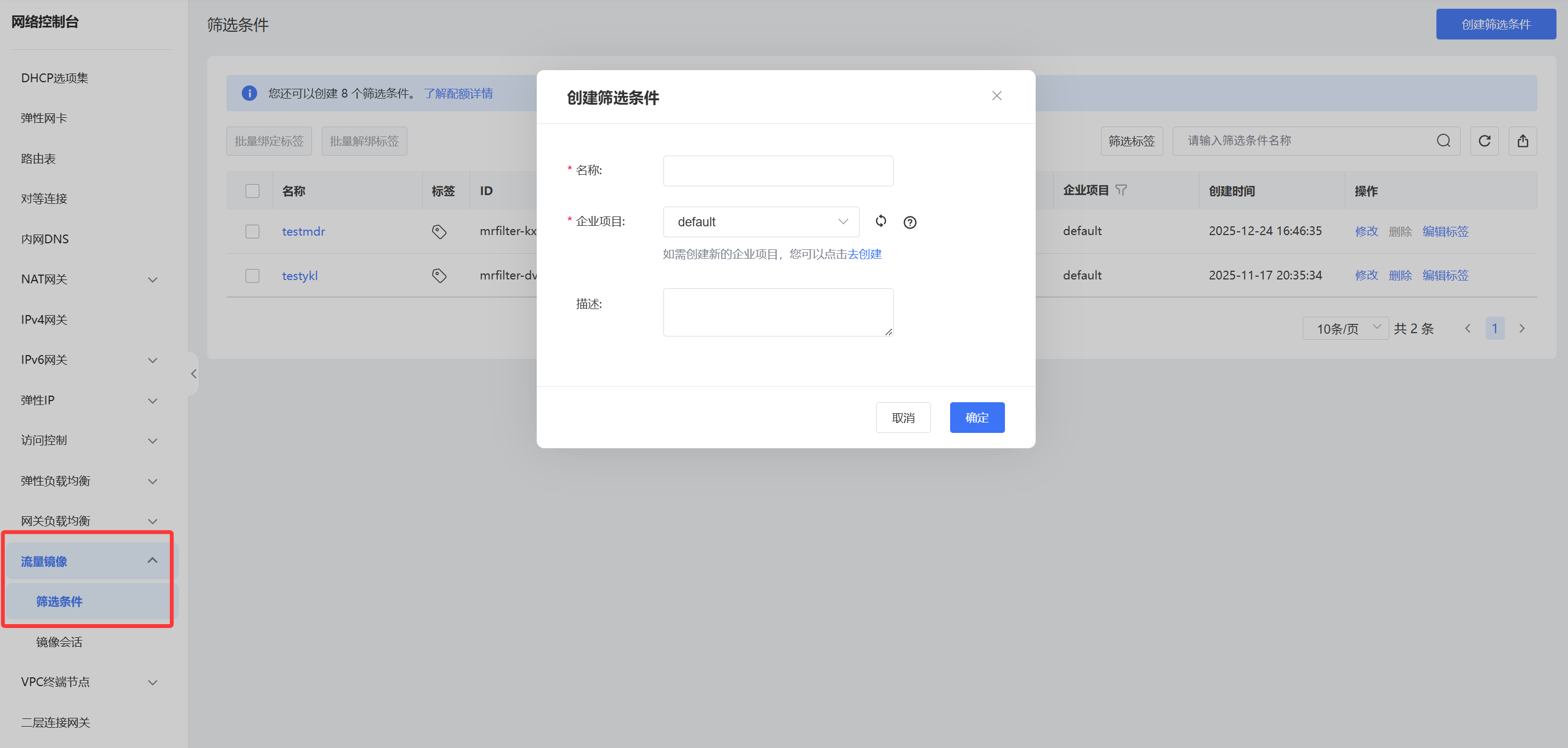登录天翼云网络控制台,在左侧选择“流量镜像 > 筛选条件”创建筛选条件。根据需要监控的云主机配置出入方向规则。