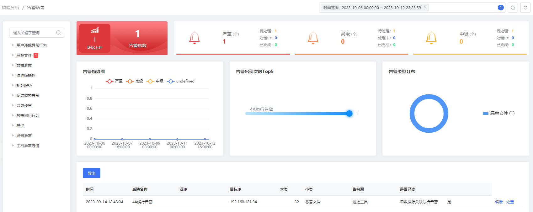 在“风险分析 > 告警结果”页面中,查看告警结果,默认展示当天告警。展示模块分为告警等级统计数量模块、告警趋势图、告警出现次数、告警类型分布以及告警列表展示。