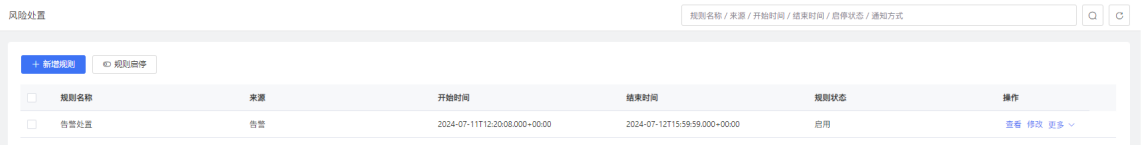 分类 参数 参数说明 基础信息 规则名称 自定义风险规则名称。 有效开始时间 选择新建风险规则开始生效的日期。 有效结束时间 选择新建风险规则失效的日期。 告警来源 来源 选择风险规则的事件来源,目前仅支持选择“告警”。 过滤规则 请您根据业务实际需求填写。 处置方式 发送时间范围 选择发送通知的时间范围。例如:周一-17:00:00-18:00:00。 工单时限 选择工单存在的时间范围,单位为“小时”。 通知方式 可选择邮件或短信通知。 邮件通知模板