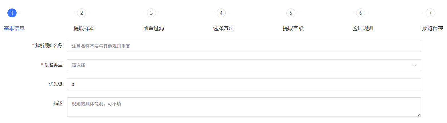 基本信息:填写“解析规则名称”和需要采集的“设备类型”。填写后在页面右下角单击“下一步”。