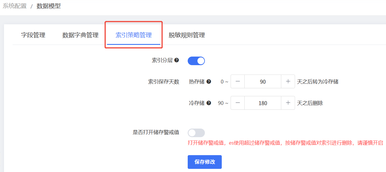 在左侧导航栏选择“系统配置 > 数据模型”,在上方选择“索引策略管理”页签。