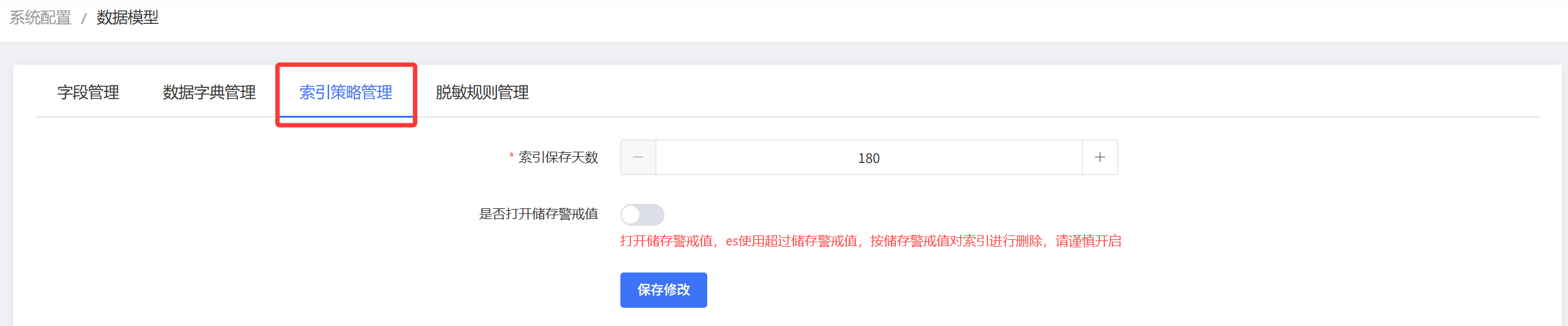 2.在左侧导航栏选择“系统配置 > 数据模型”,在上方选择“索引策略管理”页签。