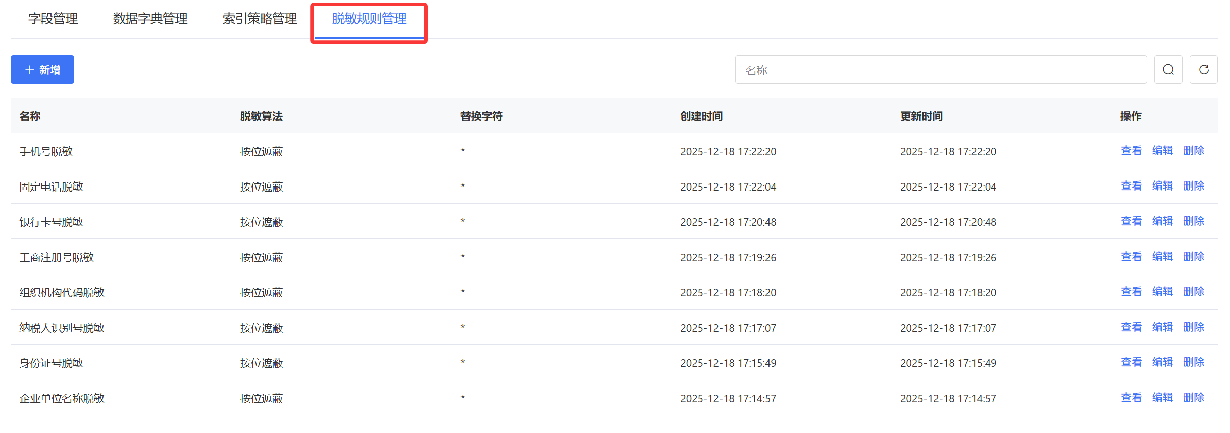 2.在左侧导航栏选择“系统配置 > 数据模型”,在上方选择“脱敏规则管理”页签。