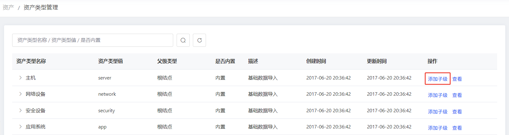 选择需要添加子级的资产类型,单击“操作”列的“添加子级”。
