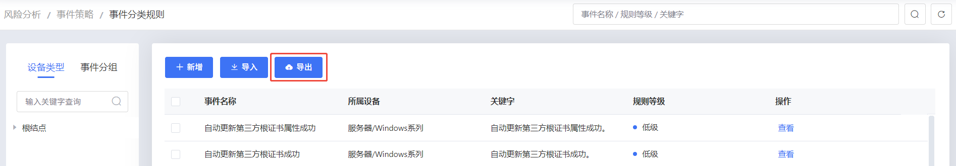 手动勾选需要导出的事件分类规则,点击“导出”按钮,可自动下载规则json文件到本地。
