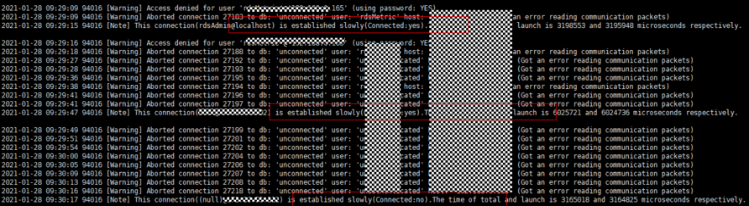 - 查看TaurusDB的错误日志,观察是否有如下信息:connection xxx is established slowly。示例: