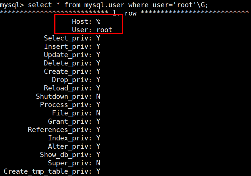 - 查看root权限,发现有两个root帐号,其中一个root限制host必须是IP必须是192开头。