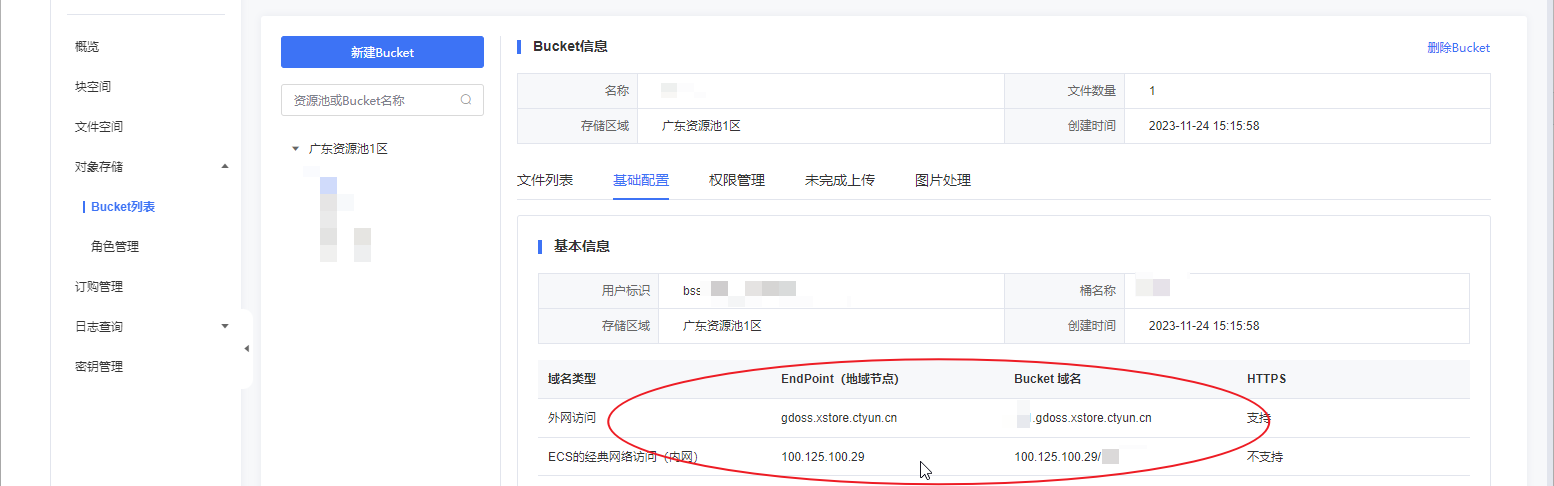- 在基本配置中可以看到该Bucket所在区域节点的Endpoint信息。