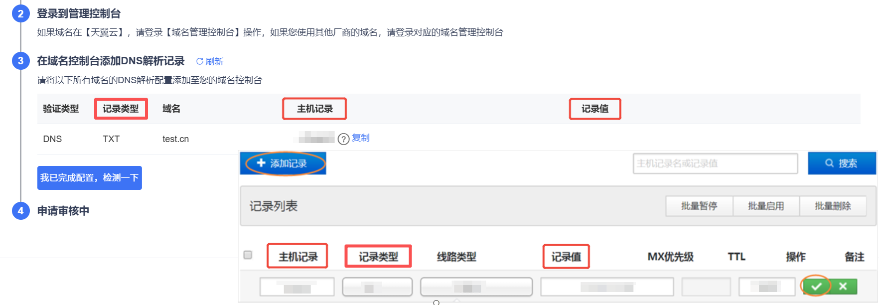 在添加记录面板,将域名认证获取到的验证信息进行添加,填写规则参见下表。