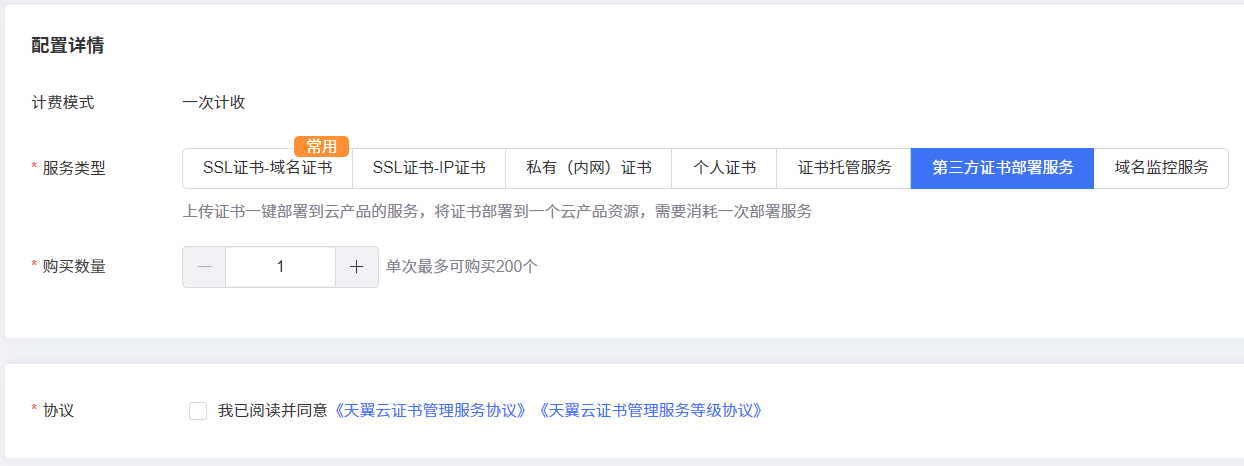 选择第三方证书部署服务的购买数量,单次最多可购买200个。